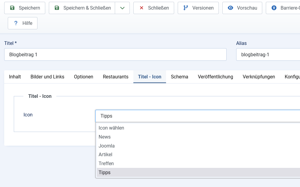 Wir erstellen nun Beiträge für unseren Blog und wählen auf der Registerkarte "Titel-Icon" das entsprechende Symbol: