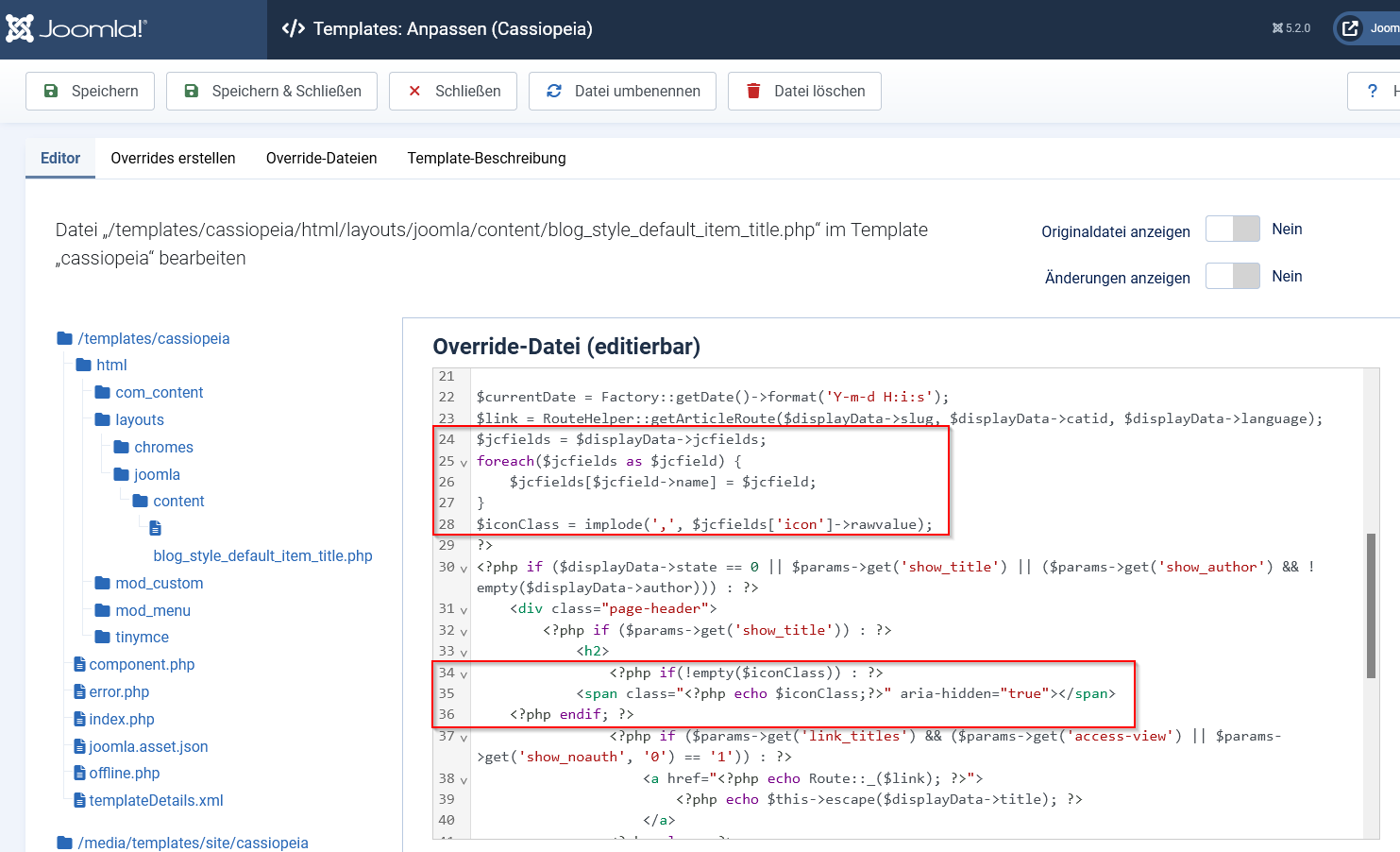 Um das Symbol im Artikeltitel anzuzeigen, müssen wir den Wert unseres Benutzerdefiniert Feldes im Override abrufen. Gehe zu System -> Site Templates -> Cassiopeia Details und Dateien und öffne die Datei blog_style_default_item_title.php (oder öffne sie mit dem Editor deiner Wahl via FTP). Füge nach Zeile 23 den folgenden Code hinzu: