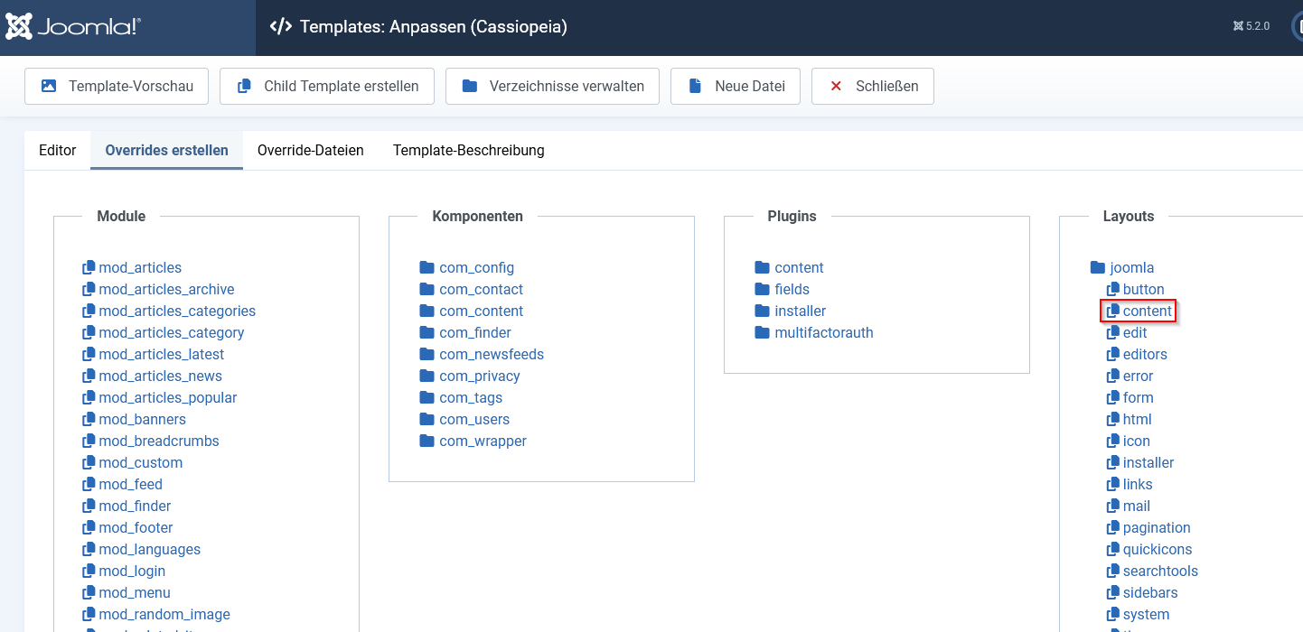 Das Dumme an dieser Methode ist, dass Joomla Overrides für alle Layouts innerhalb von Content erstellt, und das sind eine Menge. Wir haben einige Möglichkeiten, die überflüssigen Overrides loszuwerden: Wenn du einen FTP-Zugang zu deinem Server hast, kannst du zum Ordner templates/cassiopeia/layouts/joomla/content gehen und alle Dateien ausser blog_style_default_item_title.php löschen. Ohne FTP-Zugang können die nicht benötigten Überschreibungen Datei für Datei unter System -> Site Templates -> Cassiopeia Details and Files einzeln gelöscht werden.