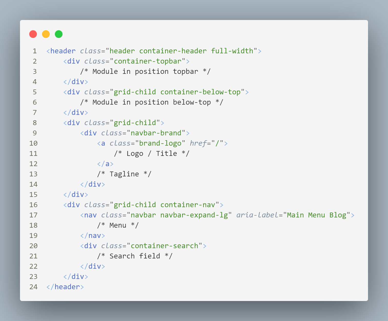 Topbar und below-top sind Modulpositionen, in die beliebige Inhalte eingefügt werden können. Häufig werden sie verwendet, um die Kontaktdaten (Adresse, E-Mail, Telefonnummer) eines Unternehmens oder andere (meist) einzeilige Informationen anzuzeigen. Brand wird verwendet, um das Logo, den Titel (als Alternative zum Logo) und den Slogan anzuzeigen, wie in der Konfiguration des Templates festgelegt. Menu und search sind wiederum Modulpositionen, die für das Menü und das Suchfeld optimiert sind.