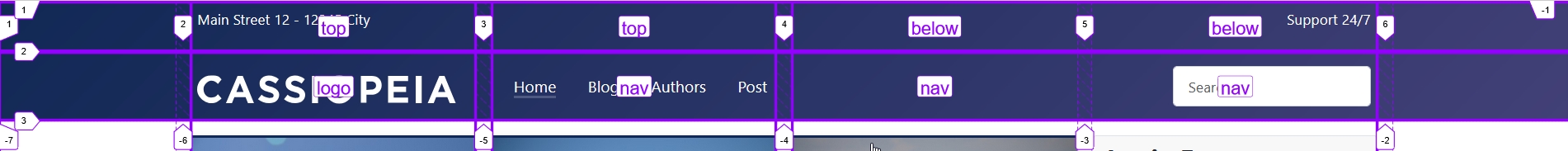 Grids können benannte Grid-lines haben (normalerweise sind sie nur nummeriert), ähnlich wie bei Grid - Bereichen; dies erleichtert die Platzierung von Elementen im Grid. Unsere Rasterlinien tragen die Namen Full-Start, Main-Start, Main-End und Full-End. Für dieses Tutorial sind die benannten Zeilen nicht wichtig, aber diese Rasterdefinition wird auch im Hauptinhalt einer Cassiopeia-Site verwendet, und die Zeilen werden zur Platzierung des Inhalts und der Seitenleiste(n) sowie zur Erstellung von Containern mit voller Breite verwendet. Die erste und die letzte Spalte sind Platzhalter, damit unsere Elemente in der Kopfzeile zentriert und am Inhalt der Seite ausgerichtet sind. Dazwischen erstellen wir vier gleiche Spalten.