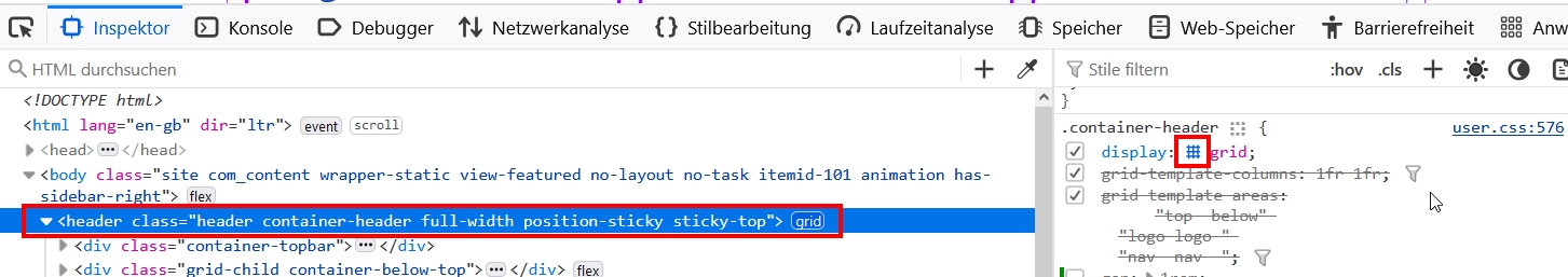 Im Browser kann man eine Visualisierung des Rasters erhalten, indem der Inspektor geöffnet und dort auf das Rastersymbol geklicket wird. Das folgende Bild zeigt den Browser-Inspektor von Firefox: