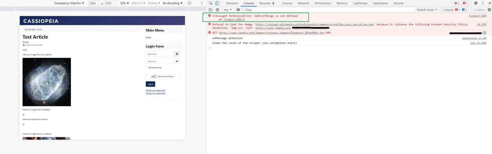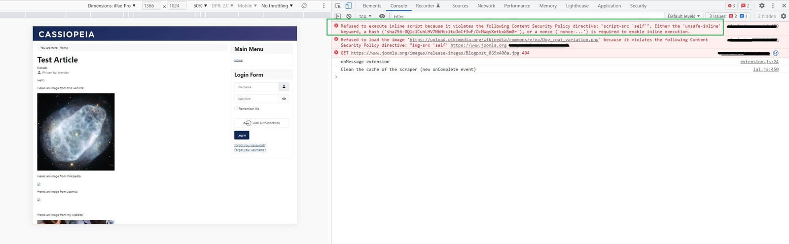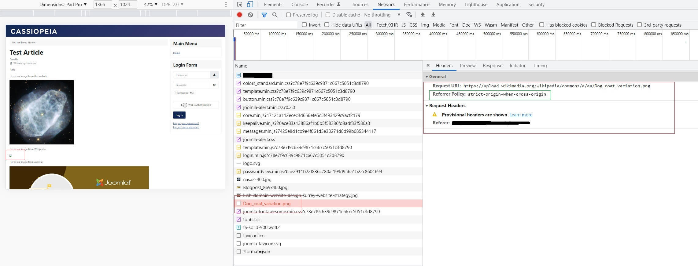 "Strict-origin-when-cross-origin" bedeutet ganz einfach, dass wenn ein HTML-Element (in diesem Fall ein Bild) von einer anderen Quelle (nicht von deinem Server) geliefert wird, die zu diesem Zeitpunkt festgelegte HTTP-Header-Richtlinie befolgt werden muss. In diesem Beispiel werden die HTTP-Header, wie sie im Joomla-Plugin eingestellt sind, alle Bilder zurückweisen, die nicht von deiner Website, oder einer anderen Website stammen, die speziell in den HTTP-Header-Parametern des Joomla-HTTP-Header-Plugins enthalten ist.