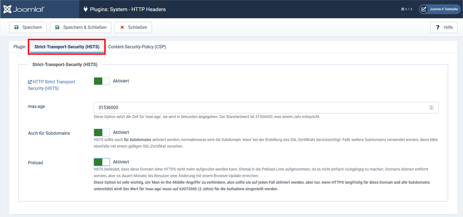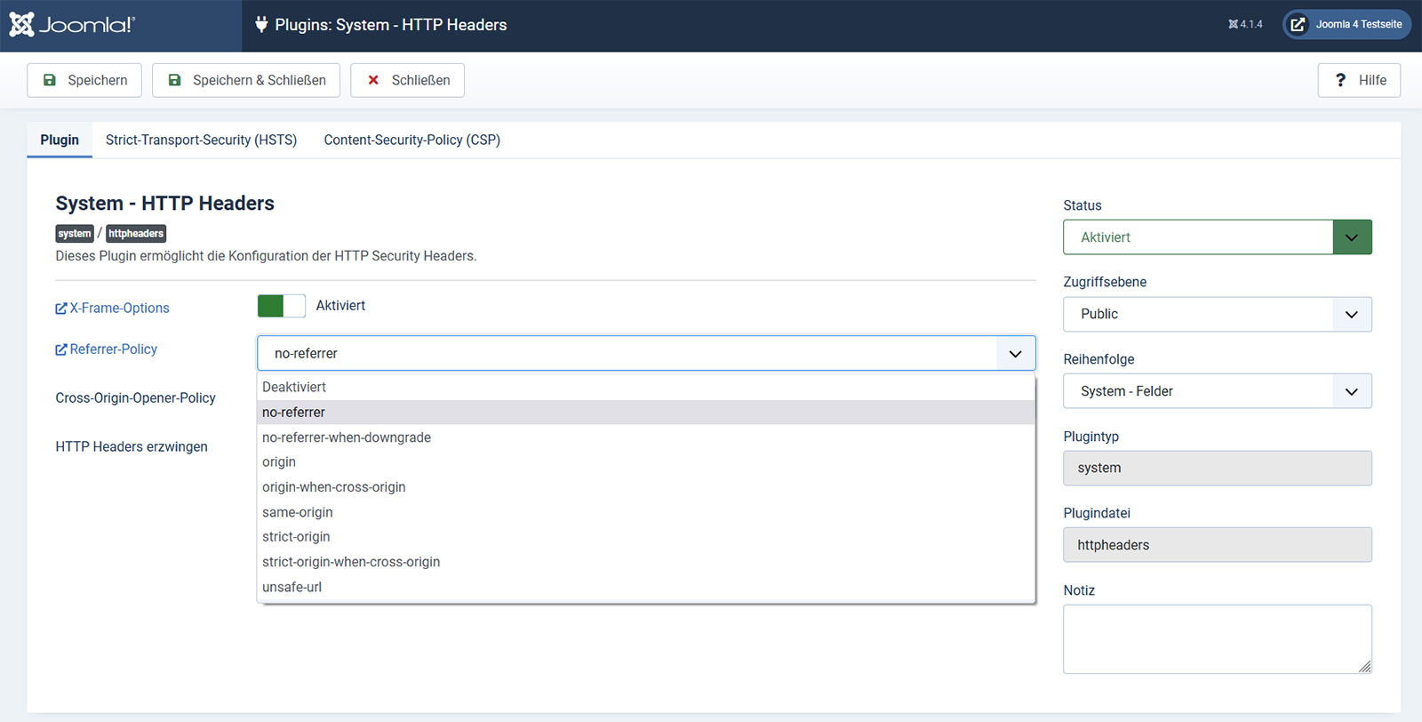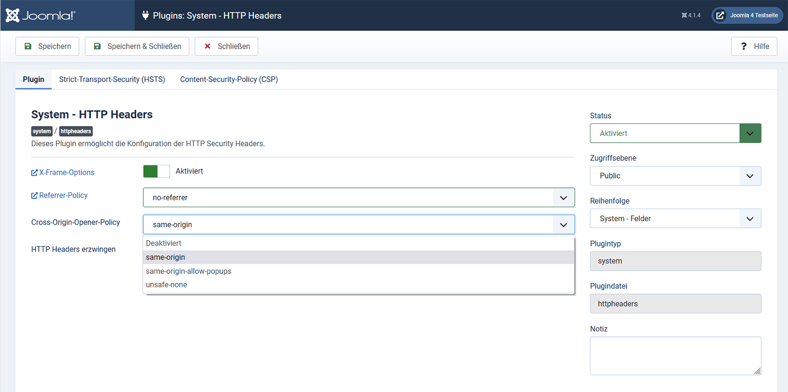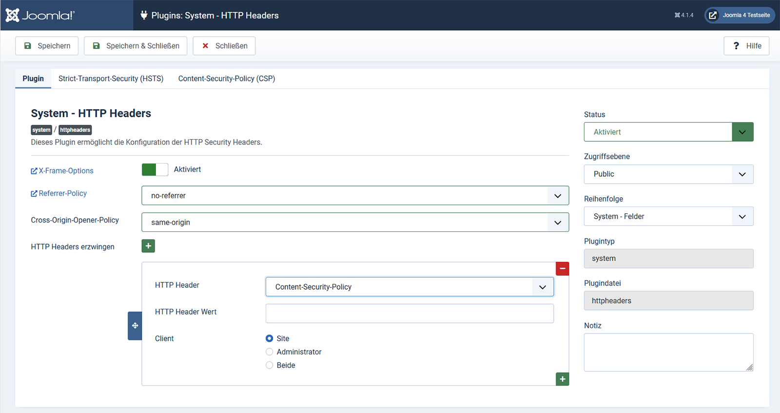 Du findest das HTTP-Headers-Plugin von Joomla im Plugin-Verzeichnis, der Zugriff darauf erfolgt auf die gleiche Weise, wie du es gewohnt bist.