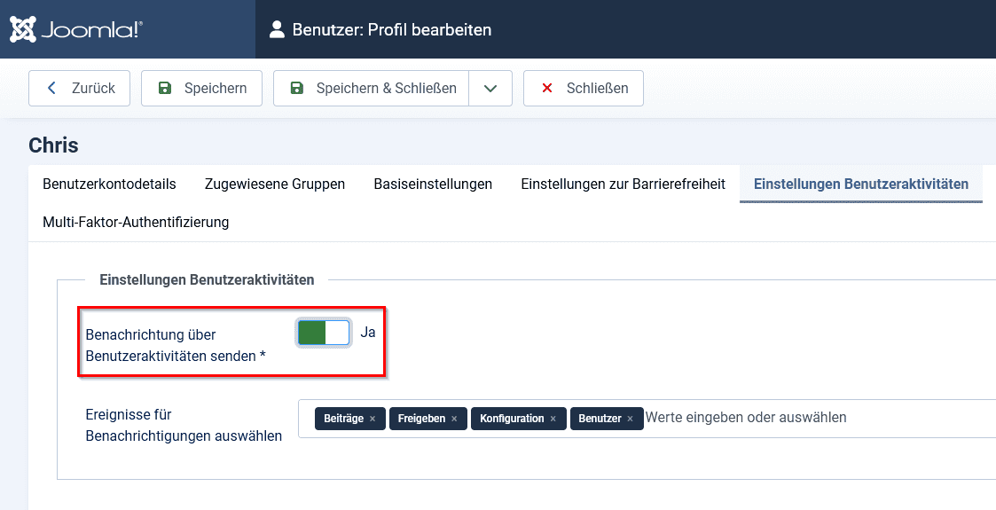 Joomla verfügt über ein praktisches Dashboard-Modul, das den Super-Usern die letzten Aktivitäten (Latest Actions) anzeigt. Dies wird durch eine Funktion innerhalb von Benutzer gesteuert, die Einstellungen Benutzeraktivitäten heisst und der erste Selektor sagt Benachrichtung über Benutzeraktivitäten senden. Dies wird pro Benutzer eingestellt. Ich weiss das, weil ich es vor einiger Zeit für meinen eigenen Benutzer auf einer Website aktiviert, aber wieder vergessen hatte. Jedes Mal, wenn ich mich einloggte, einen Inhalt bearbeitete oder etwas in der Konfiguration änderte, erhielt ich eine E-Mail. Jedes Mal! Heute Morgen habe ich die Option E-Mail-Benachrichtigungen ausgeschaltet und mein Posteingang ist wieder geschrumpft.