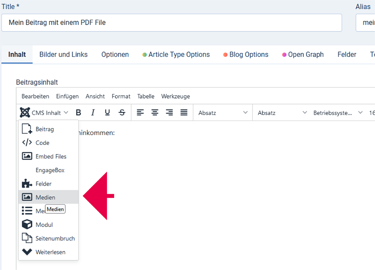 Im Editor (ich verwende hier den eingebauten Editor TinyMCE) gibt es links über dem Inhaltsbereich eine nette Schaltfläche namens CMS Content. Wenn du darauf klickst, siehst du eine Liste von Dingen, die du hinzufügen kannst. Wähle Media.