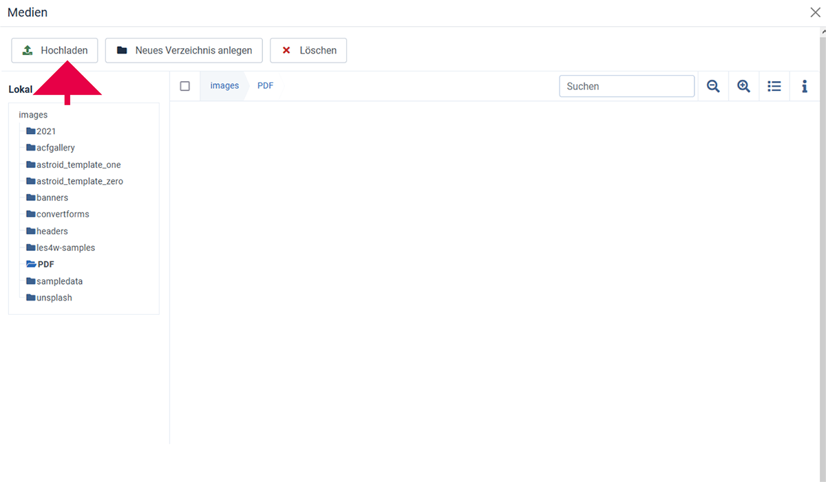 Das Media-Pop-up öffnet sich. Klicke auf die Schaltfläche Hochladen in der oberen linken Ecke, um eine Datei von deinem Computer hochzuladen.