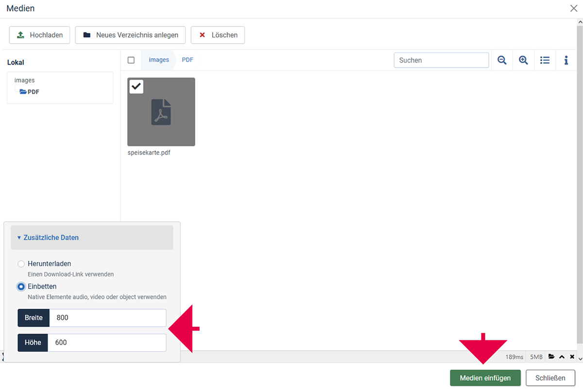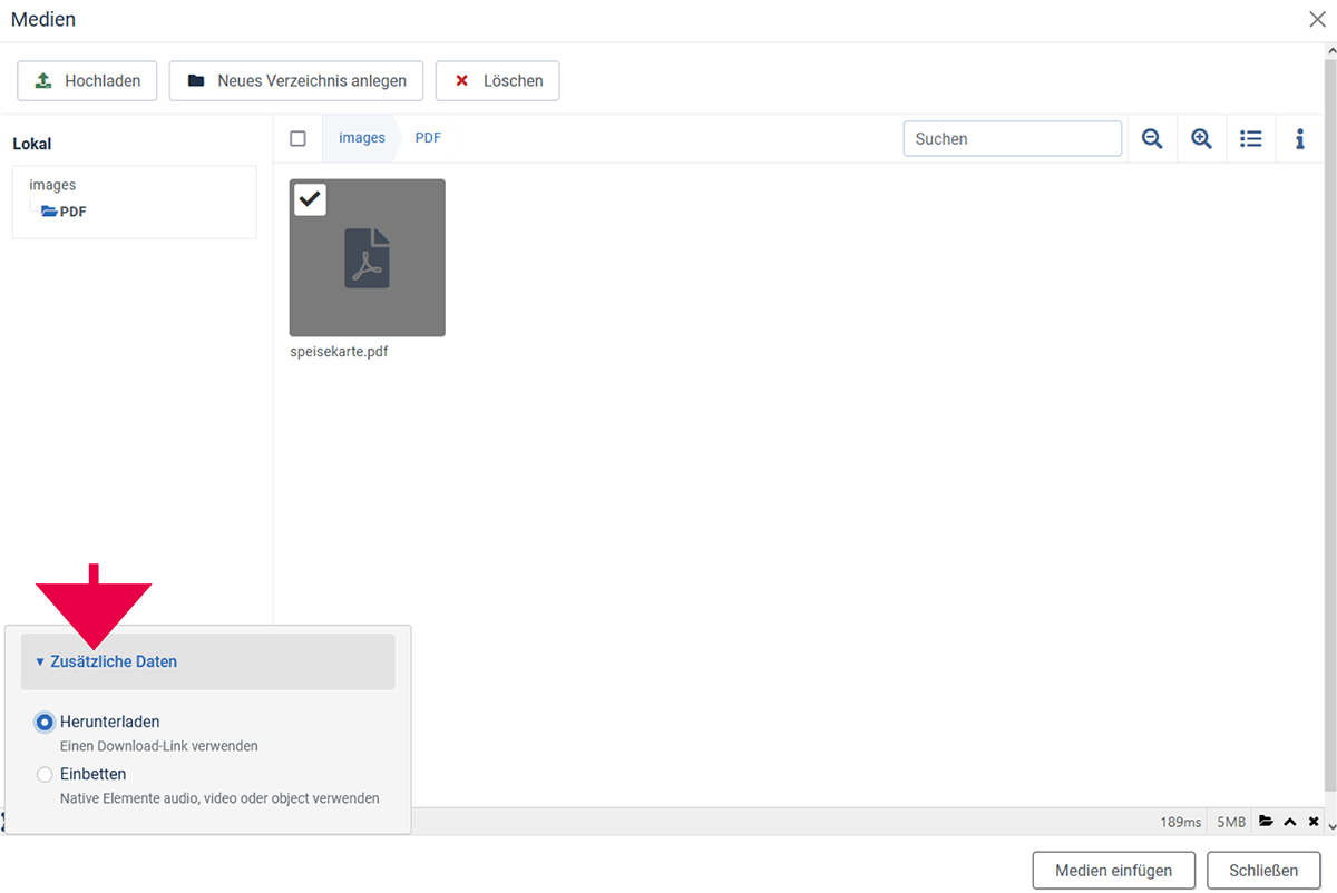 Jetzt wird es interessant! Es öffnet sich ein Pop-up-Fenster, in dem du wählen kannst, ob die Datei heruntergeladen oder eingebettet werden soll.