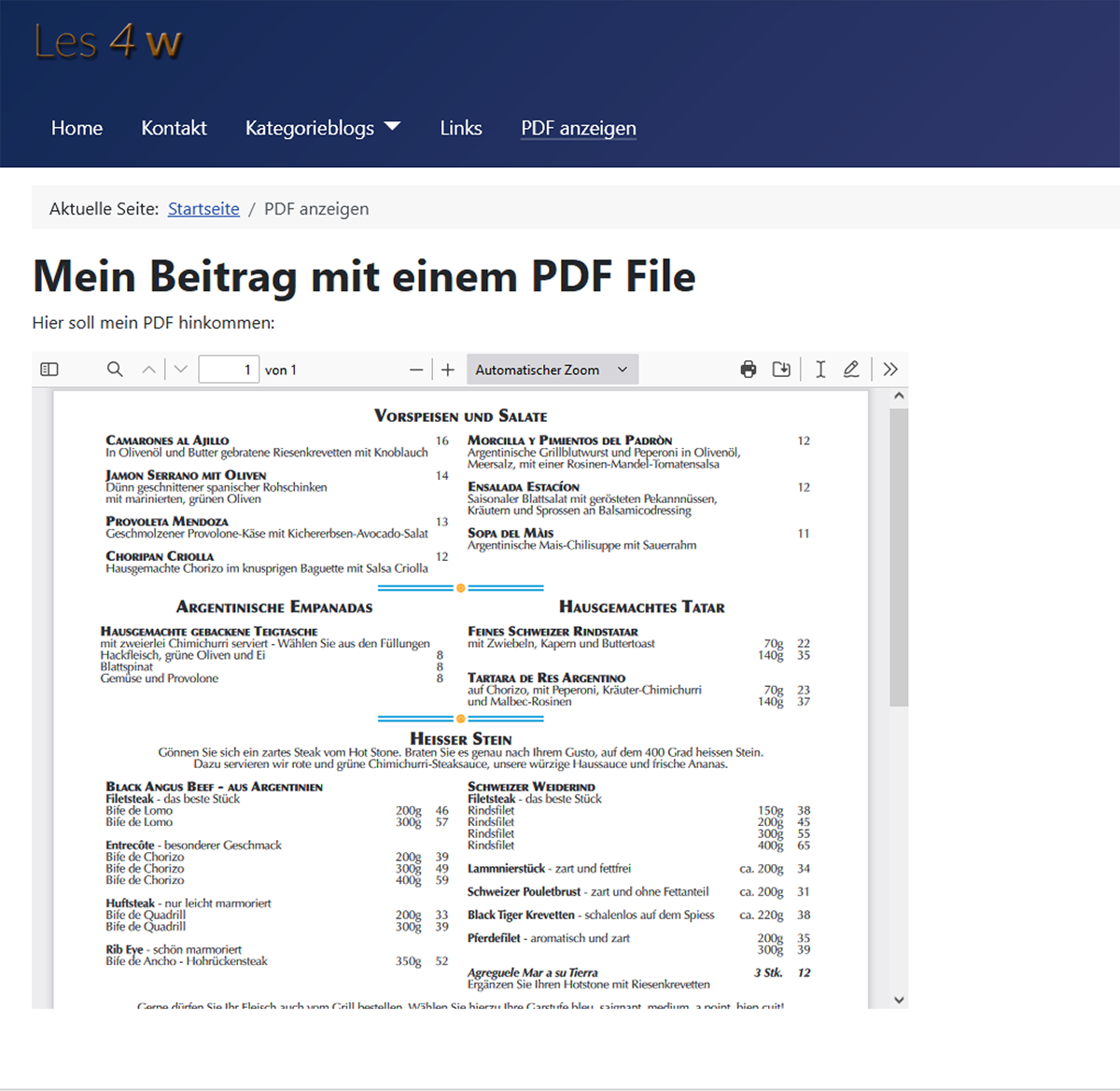 Wechseln wir nun zum Frontend der Website, um zu sehen, wie es auf der Seite aussieht. Der Beitrag hat einen Viewer mit der PDF-Datei, du kannst das ganze Menü lesen, ohne es herunterladen zu müssen.