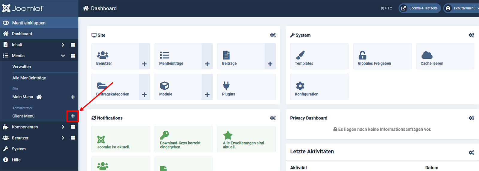 Klicke auf Menüs, und öffne das soeben erstellte Client-Menü.