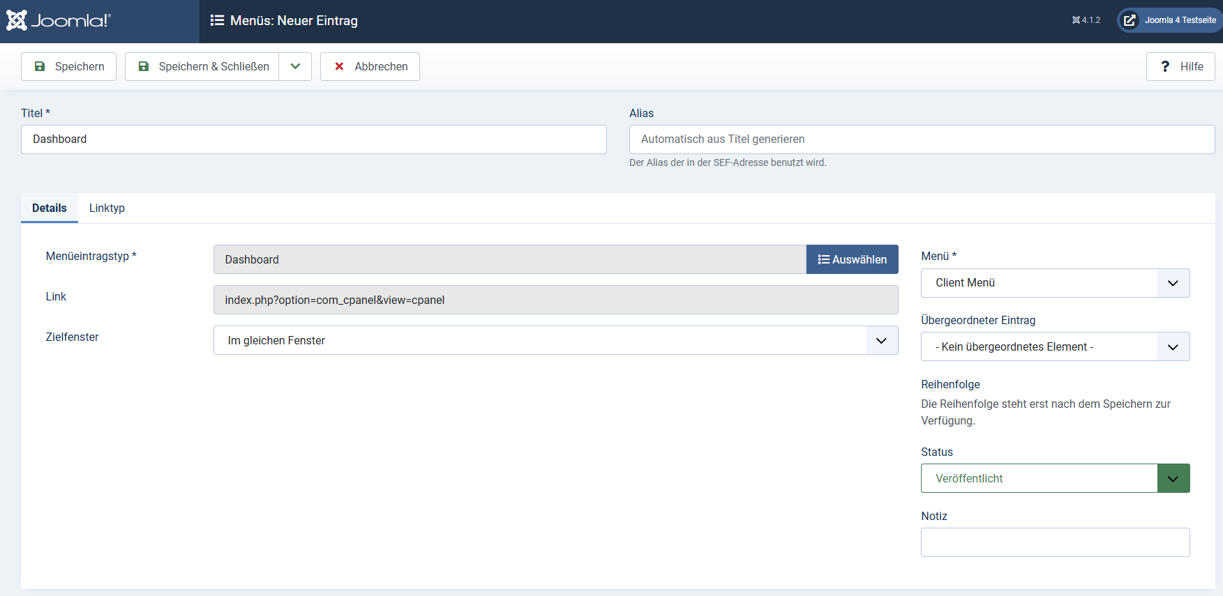 Erstelle einen neuen Menüpunkt, wie du es bei einem Front-End-Menü tun würdest. Als Beispiel werden wir einen Menüpunkt erstellen, der zum Home Dashboard führt.