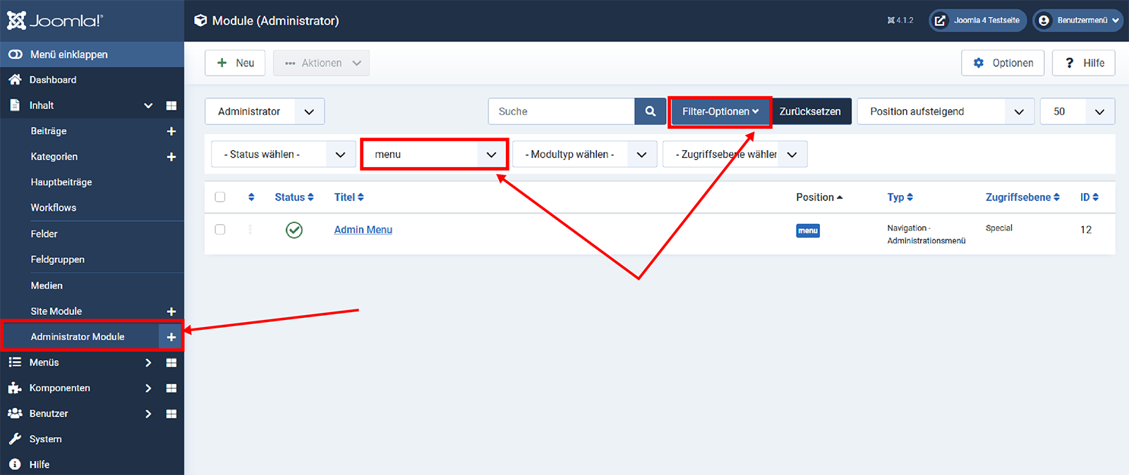 Sobald du bereit bist, klickst du im Menü auf "Inhalt" und dann auf "Administratoren-Module".