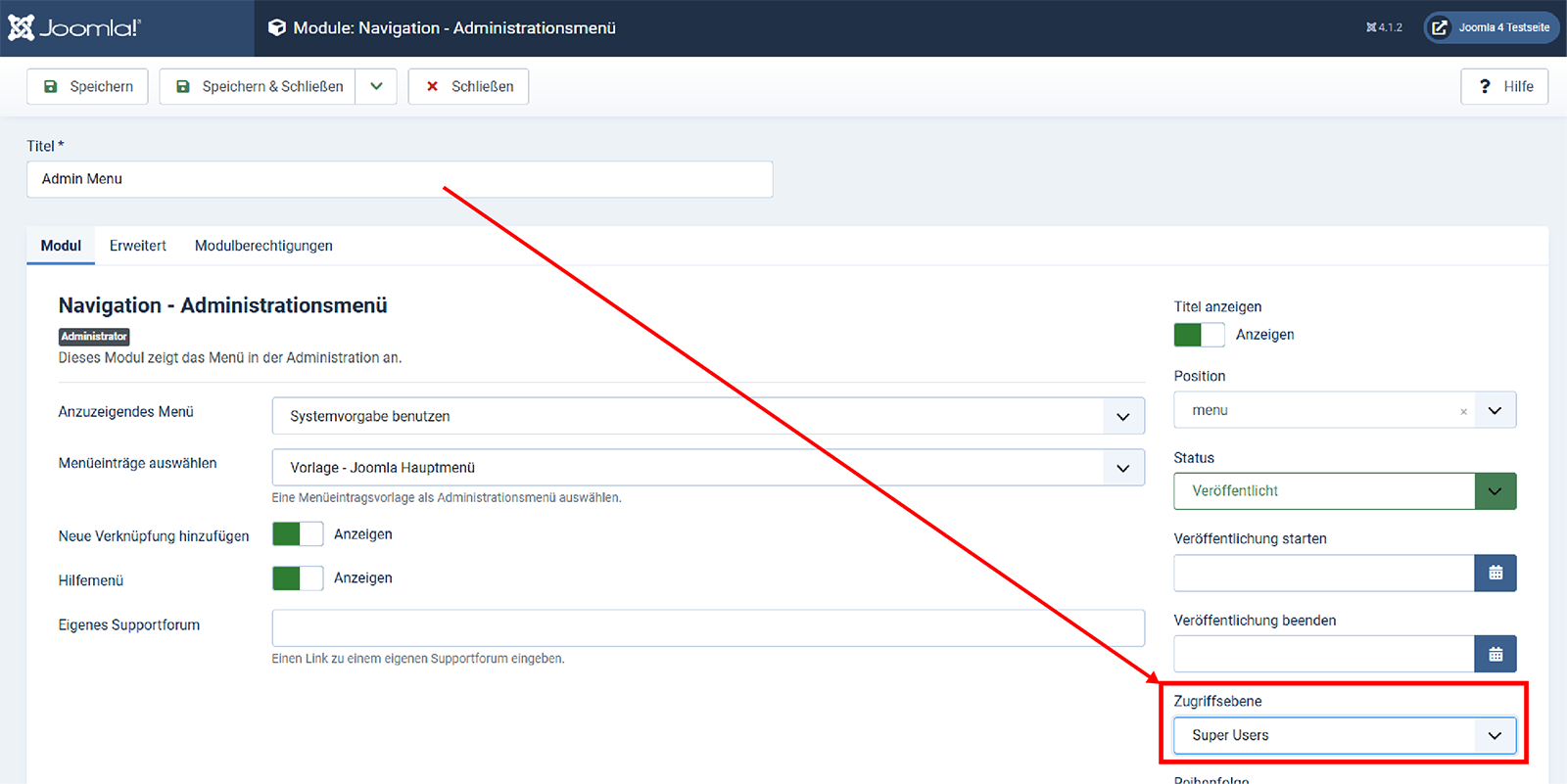 Klicke auf "Admin Menu", um es zu bearbeiten. Suche das Dropdown-Menü "Zugriffsebene" (eventuell musst du nach unten scrollen) und wähle dann "Super Users". Dann speichern und schließen.