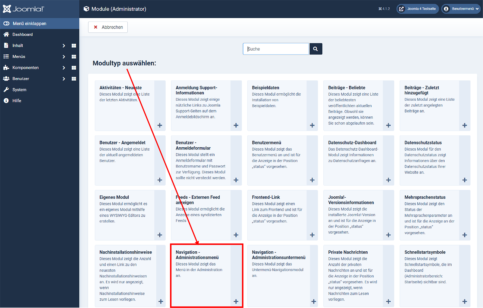 Klicke im Menü auf "Inhalt" und dann auf das Plus-Symbol neben "Administratormodule", um ein neues Modul hinzuzufügen.