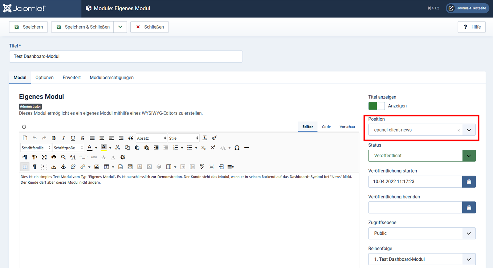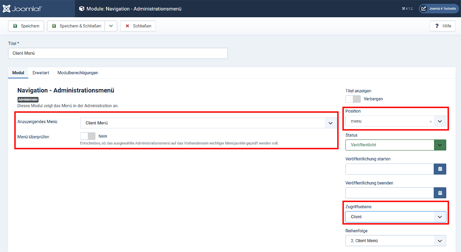Da wir die Administratorenmodule bereits nach der Menüposition gefiltert haben, ist diese bereits vorausgefüllt, aber überprüfe das trotzdem noch einmal.