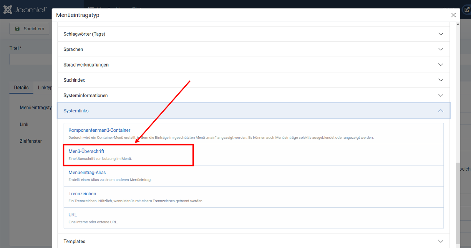 Wähle den Typ des Menüpunkts: Scrolle nach unten zu Systemlinks und wähle Menüüberschrift.