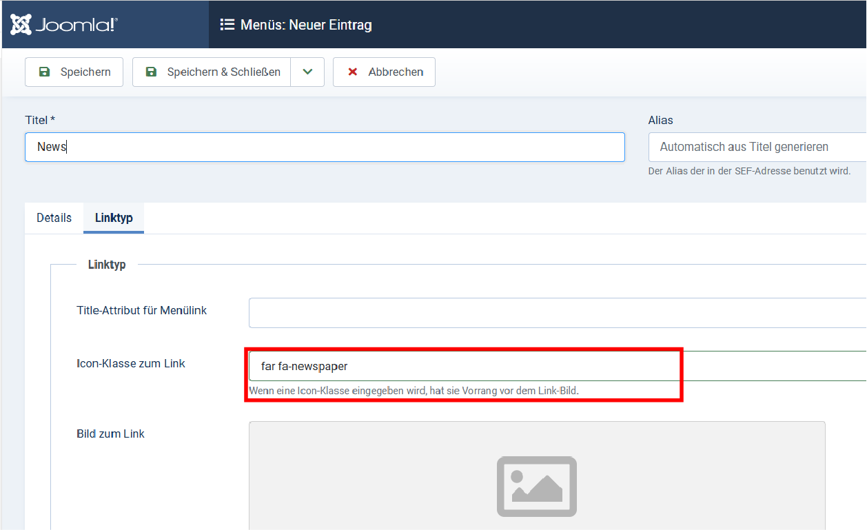 Wenn du möchtest, kannst du auf der zweiten Registerkarte ("Link Type") ein Feld mit der Bezeichnung "Link Icon Class" anzeigen. Du kannst hier ein Font Awesome-Symbol hinzufügen - Joomla 4 hat die kostenlosen Font Awesome 5-Symbole in das Backend geladen. Hier findest du alle Icons.