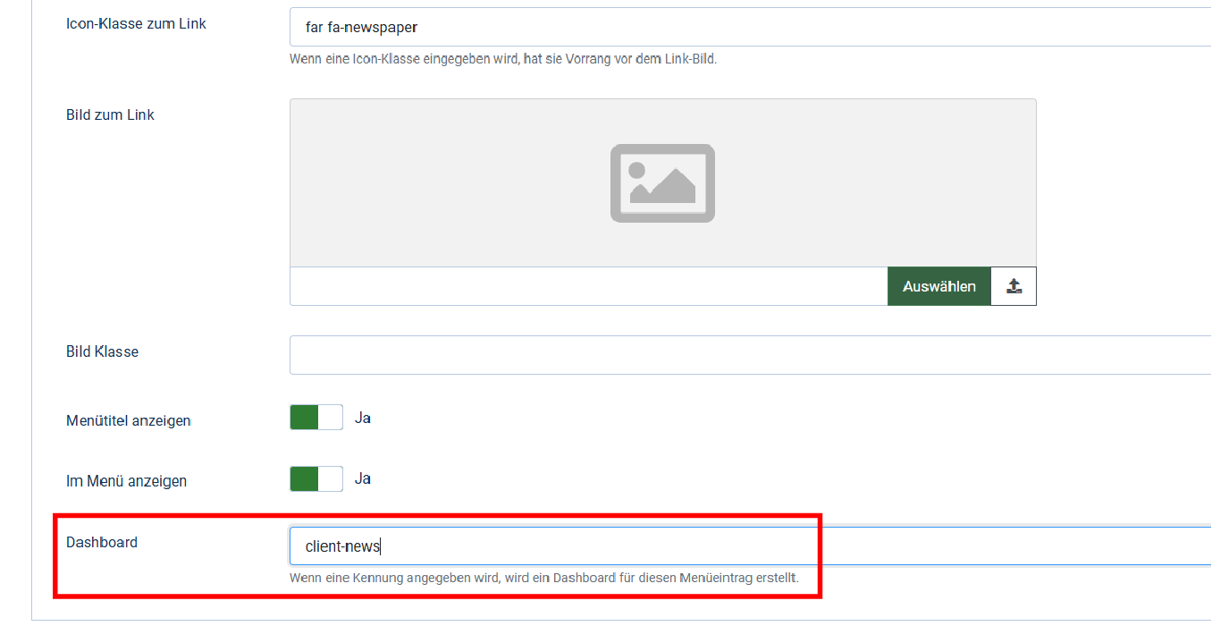 Aha! Hier beginnt nun die Magie. Der Hilfetext lautet hier: Wenn eine Kennung angegeben wird, wird ein Dashboard für diesen Menüpunkt erstellt.