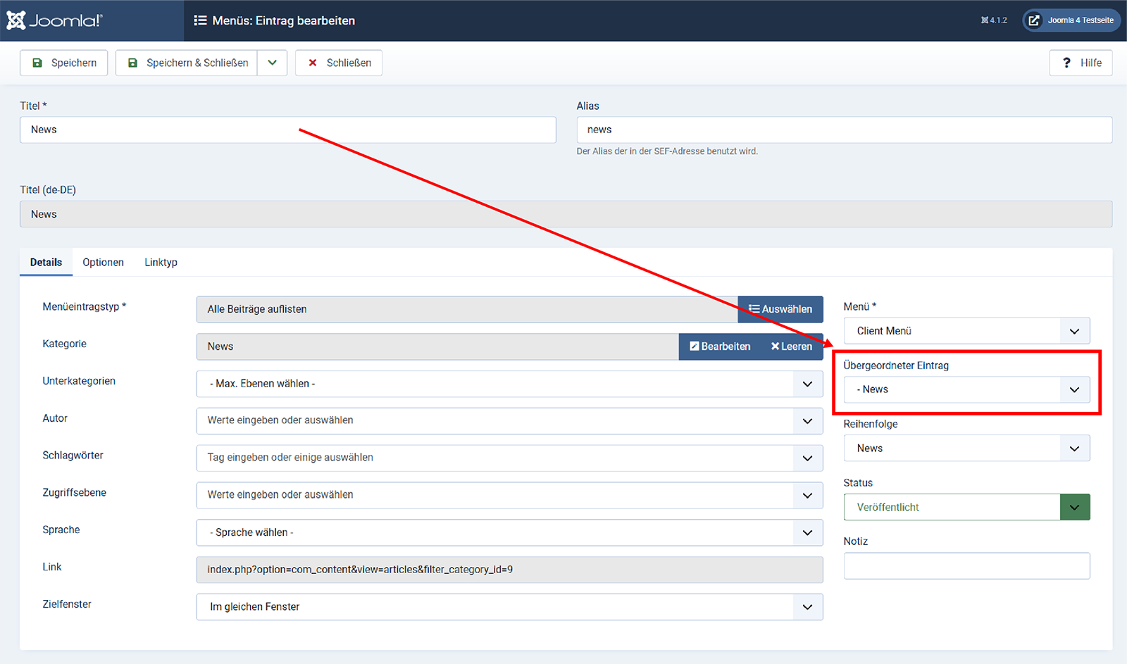 Füge mindestens noch einen verschachtelten Menüpunkt hinzu. Dies ist notwendig, da sonst die Menü-Überschrift nicht angezeigt wird. In meinem Beispiel werde ich "Alle Artikel auflisten" in der Kategorie "News" verwenden. Vergewissere dich, dass du die soeben erstellte Menü-Überschrift als "übergeordnetes Element" auswählst, etwa so: