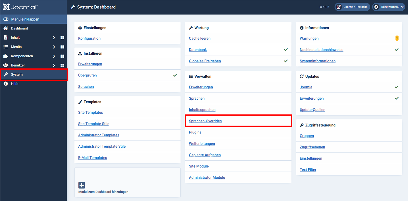 Klicke in deinem Superuser-Konto auf System und dann auf "Sprachen Overrides".