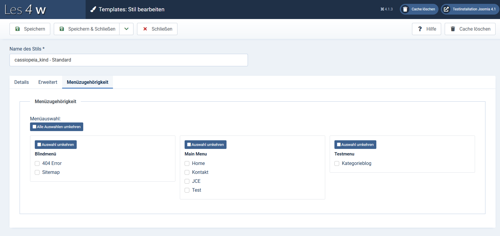 Wähle die Stil, die du zuweisen möchtest, und wähle dann die dritte Registerkarte "Menüzugehörigkeit". Dort kannst du auswählen, welche Menüpunkte dein Child Template verwenden sollen.