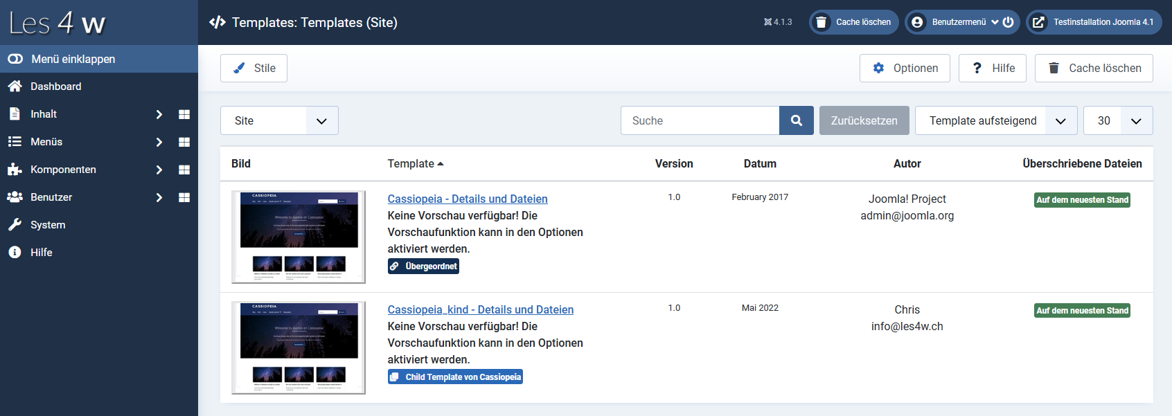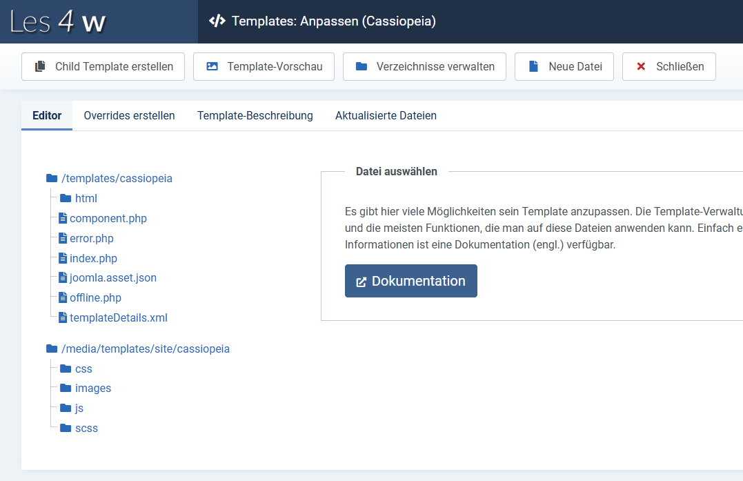 Es wurden einige Änderungen in den Hauptdateien der Templates vorgenommen, um dies zu ermöglichen. In der Cassiopeia-Vorlage finden sich in der XML-Datei einige neue Elemente.
