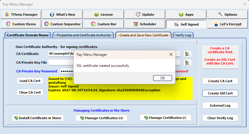 Das CA-Zertifikat wird gewählt, das Passwort eingegeben und mit Load CA Cert wird das Zertifikat geladen. Ein Klick auf Create SSL Cert erzeugt nun ein neues Zerifikat. Eine Bestätigungsmeldun schliesst den Prozess ab: