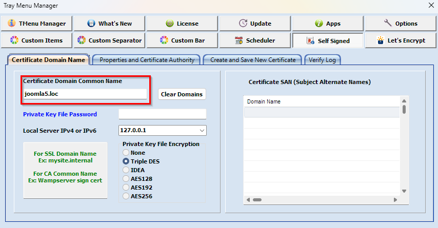 Im Beispiel erstellen wir ein Zertifikat für eine Webseite namens joomla5.loc. Wir geben diesen Namen ein.
