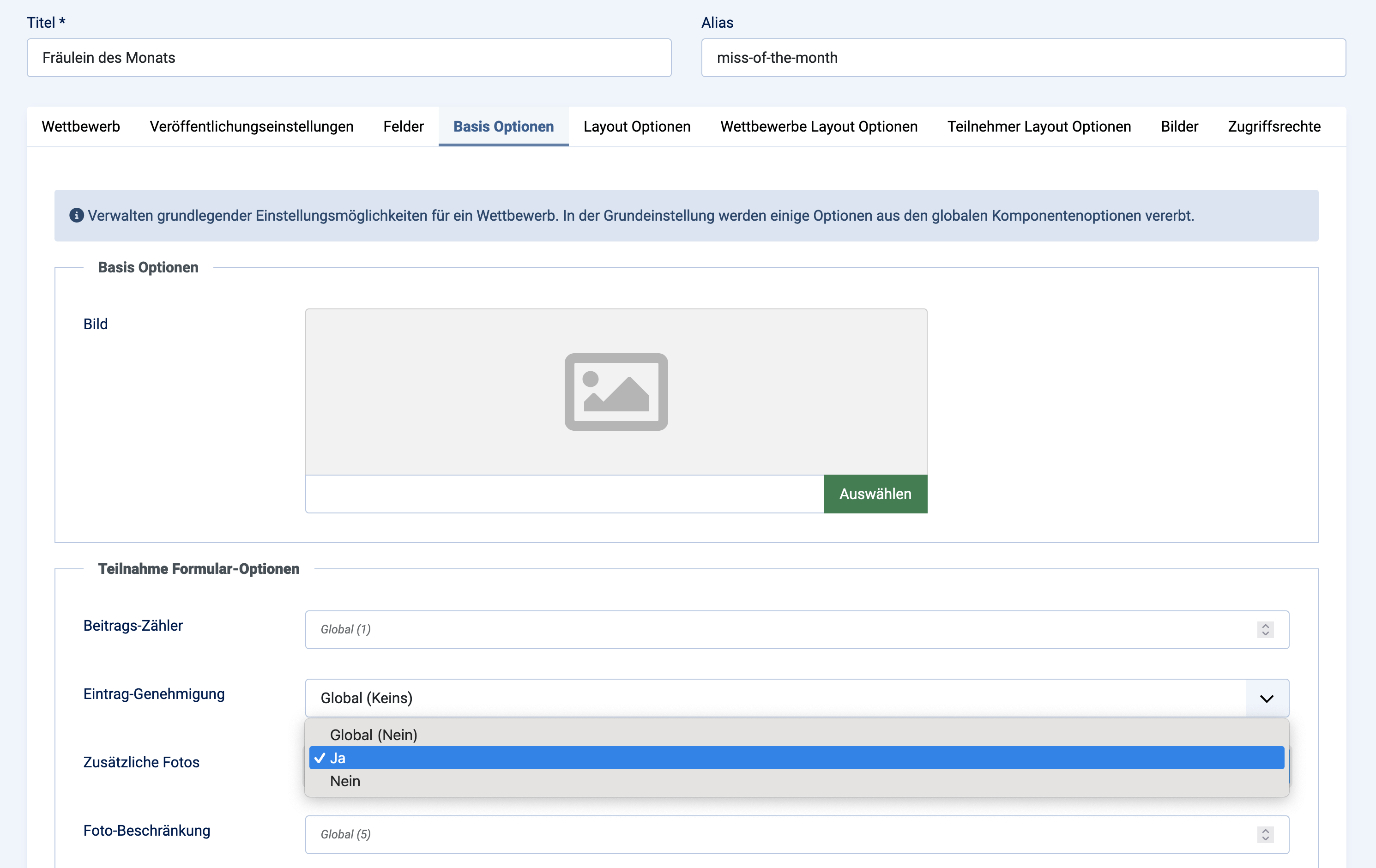 Hier sollten wir die Grössenparameter für die Bilder festlegen, die von der Komponente generiert werden sollen: Thumbnail, mittlere und grosse Bilder. Übrigens können Breite und Höhe dieser Bilder im Bearbeitungsmodus des Wettbewerbs individuell eingestellt werden. So können Wettbewerbe mit unterschiedlichen Bildgrössen erstellt werden. In manchen Fällen benötigt man zum Beispiel vertikale und horizontale Fotos in verschiedenen Wettbewerben.