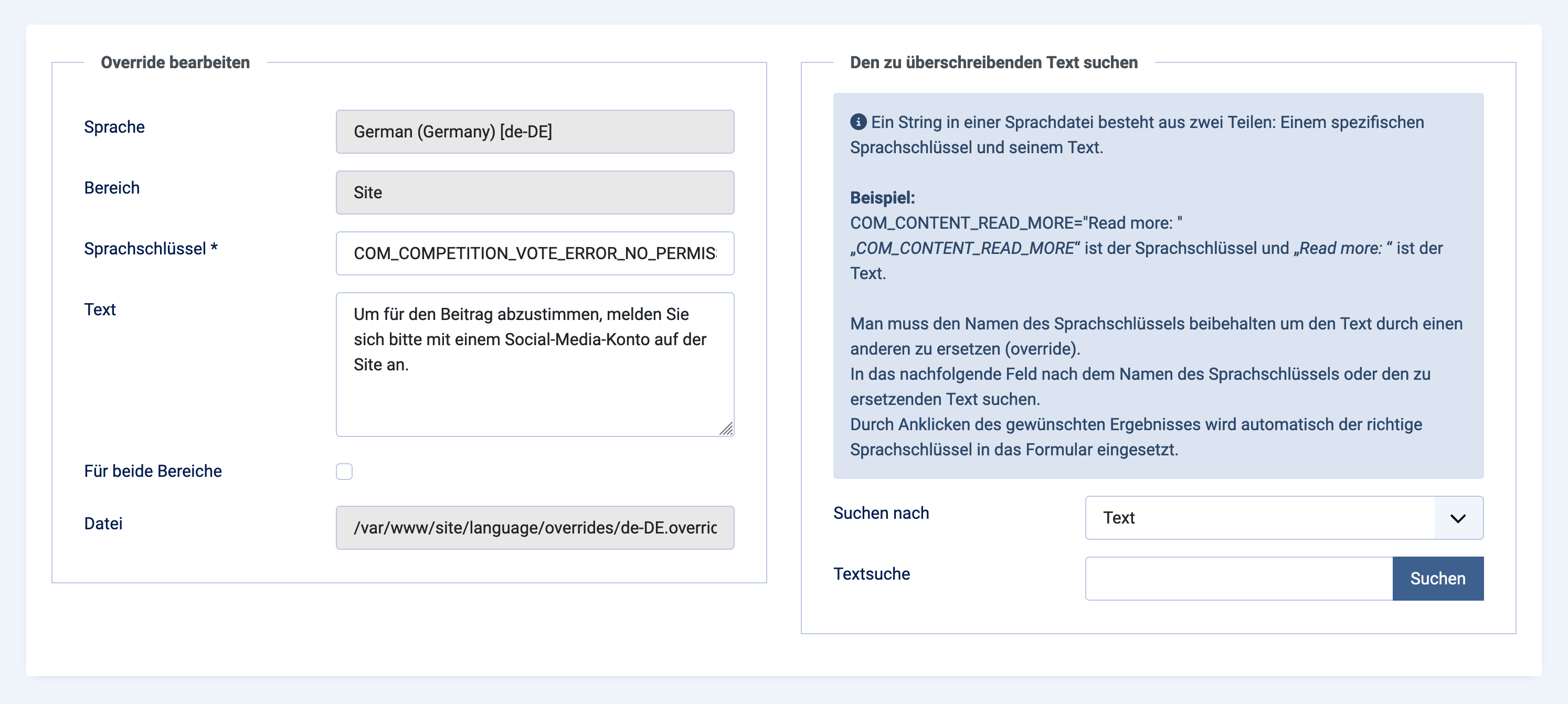 Gehe zu Erweiterungen > Sprachen-Overrides > Neu. Versuche, den Wert zu suchen, um die erforderliche Konstante (COM_COMPETITION_VOTE_ERROR_NO_PERMISSIONS) zu erhalten, setze die neue Überschreibung und speichere sie. Jetzt erhalten wir die neue Meldung: "Um für den Beitrag zu stimmen, melden Sie sich bitte mit Ihrem Social-Media-Konto auf der Website an".